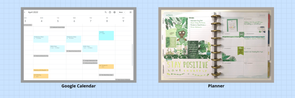 Finding an organization method that works with your thinking process is crucial to staying on top of things. Make sure it’s something you enjoy looking at, keeping track of, and keeping organized. I typically keep 2 types of organization: one digital via Google Calendar and one physical with a planner. Why do I keep 2 different systems? There are pros and cons to each.