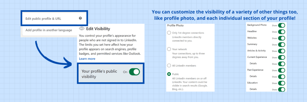 To access this setting, click “Edit public profile & URL” on the upper right-hand corner of the screen while on your profile page. Then, the option to select visibility should appear on the right-hand side!
