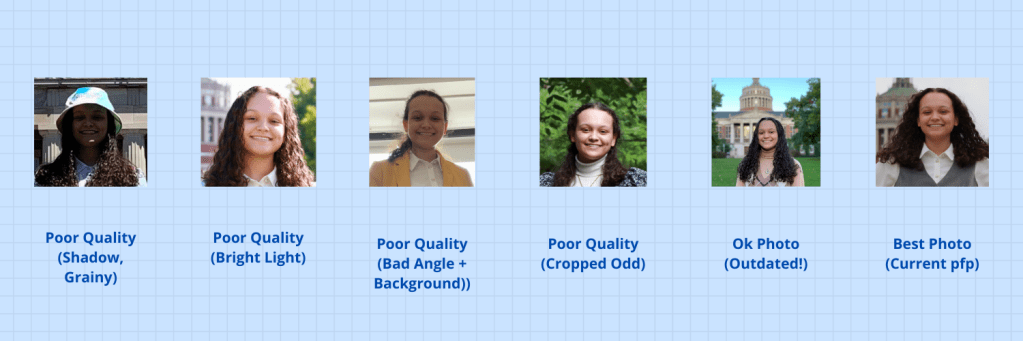 An additional photo tip: Make sure you crop the photo correctly when applying it to your profile! You may initially think that having your face centered makes more sense, but this actually throws the image off a lot, so try to have your head a little more towards the top of the circle boundary–this also lets you show off your outfit a bit more. You should also try to update your profile photo once a year.