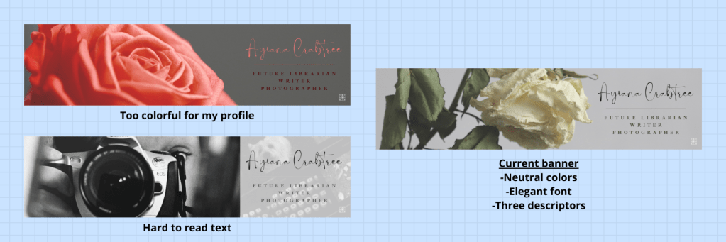 The photo or background choice is yet another opportunity to show people your artistic side (if you have one) or at least to show people what your favorite color is. You want something that’s going to complement your profile photo, so for me, that meant another neutral-colored image, and of course, as I love photography, that also meant using a photo I took! I don’t have photoshop, so I chose a photo that left a lot of blank space to the right of the photo.