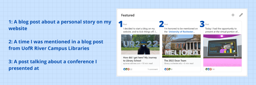 Having featured posts relies on actually posting content, of course, so you should strive to post about any important events in your career, such as starting a new job or at a new degree program, when you present at a conference, if you wrote a blog post, or were interviewed for or mentioned in an article. An important part of posting is adding relevant images where applicable. Images catch people’s attention and draw them to engage with your post for a longer amount of time. Typically when you add a link to a post, the featured image from the article or webpage will appear in the post, which is a great help.