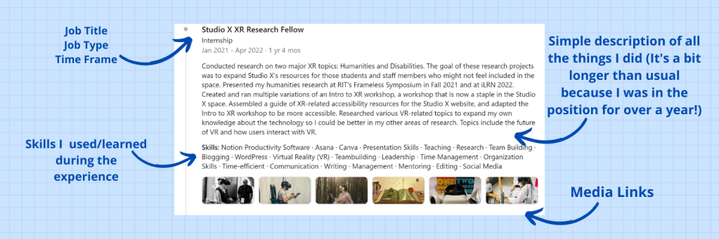 The projects section should be where you add anything that required extensive research or planning. I wouldn’t add class projects here unless they were an entire semester in the making though. For example, I added the creation of my Introduction to XR Workshop to this section, as it took me more than half a year to assemble the final product and redesign it when new variables popped up. If you add a project, don’t forget to link to your final product as well! Showcase your work as much as you can; that’s what your profile is for.
