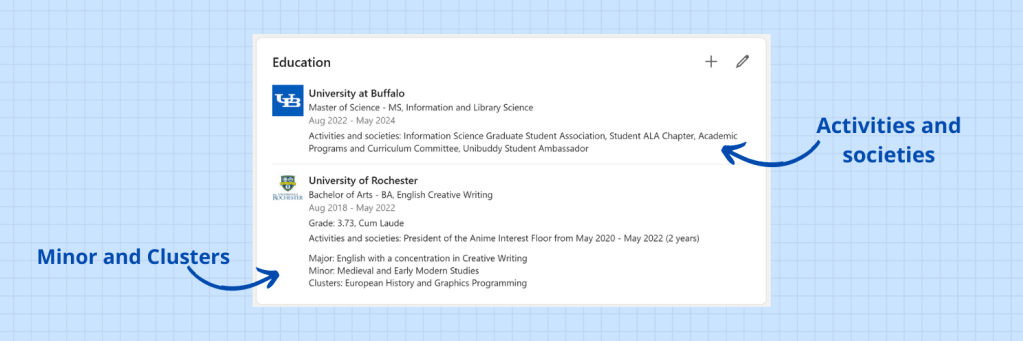 This category is pretty self-explanatory, you add what colleges you went to and the degree programs you completed while there. However, the majority of people don’t take advantage of the Activities and Societies or Description sections. These allow you to describe a little more in detail the extracurriculars you participated in and any minors you may have completed as part of your degree.
