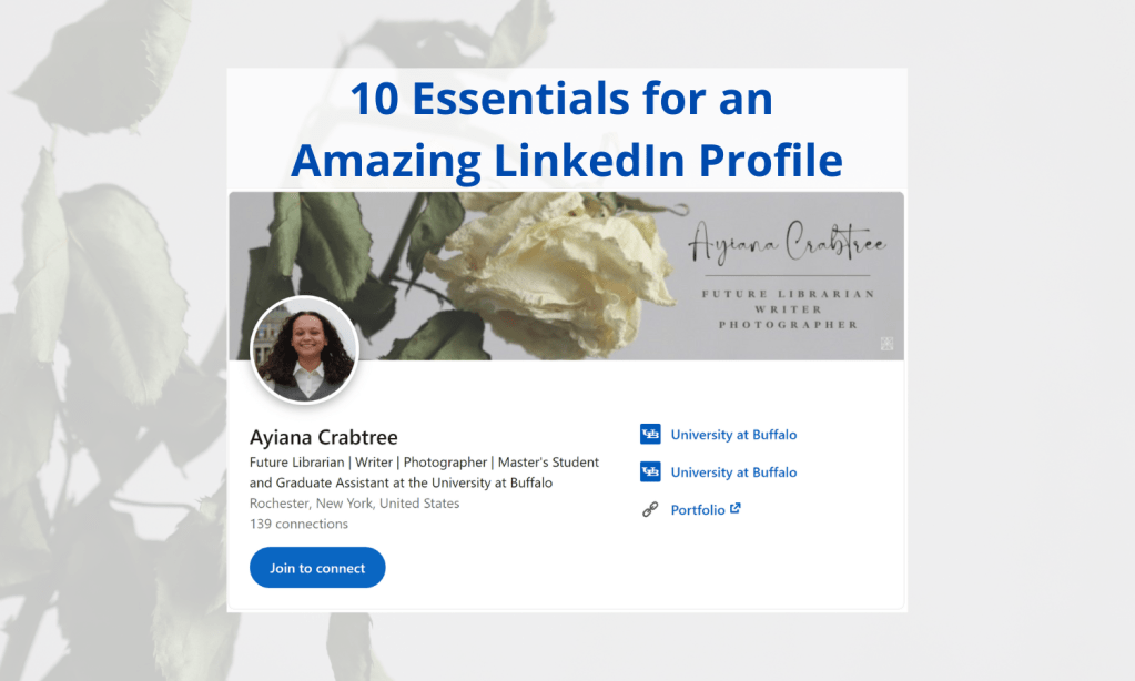 Your headline is the first bit of text that appears below the name on your profile. Most people will simply put their job title there, but that’s no fun! I recommend putting the descriptors you used in your banner here, or, if you didn’t want to have descriptors in your banner, now’s the chance to pick some things to showcase. Think about your field and some skills you have that will be useful for a future job. In my case, I chose my first descriptor to be “Future Librarian” as I feel that showcasing my desired profession is important. My other two descriptors highlight skills that I’m proud to have, “Writer” and “Photographer.” I take pride in my writing and photographing abilities, which is why I chose to highlight them rather than picking something like “Leader,” or “Researcher,” which may be more directly applicable to my field. After highlighting those things, I then added my “job title,” Master’s Student and Graduate Assistant at the University at Buffalo. Your headline may look very different from mine; you may choose not to add your job description or add a tagline as some other people do, but I at least recommend having one descriptor in there somewhere!
