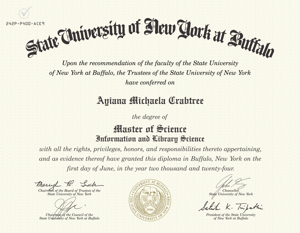 Hi! I’m Ayiana Crabtree. I’m a Student Success Librarian at SUNY Polytechnic, and alumni of the University at Buffalo Master of Science in Information and Library Science (MS-ILS) program (2024). I do a lot of different things at my job, from planning, promoting, and carrying out student-focused library events to teaching one-shot research-focused instructional sessions. I love that my job allows me to be creative in everything I do, making promotional materials, developing informational workshops, submitting conference proposals, and serving on various professional committees to help build my network. I’m a member of ASIS&T, SUNYLA, Beta Phi Mu, ALISE, ALA, BCALA, and NYLA. Chair for NEASIST. Campus delegate for SUNYLA. Director on the Executive Board for Beta Phi Mu.