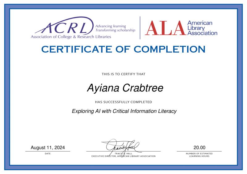 From May 28-31 I attended the ASIS&T’s IDEA Institute for AI to learn about how AI has, is, and will impact libraries as the technology develops. This certification provides recognition of my commitment to continuing education in this area.
